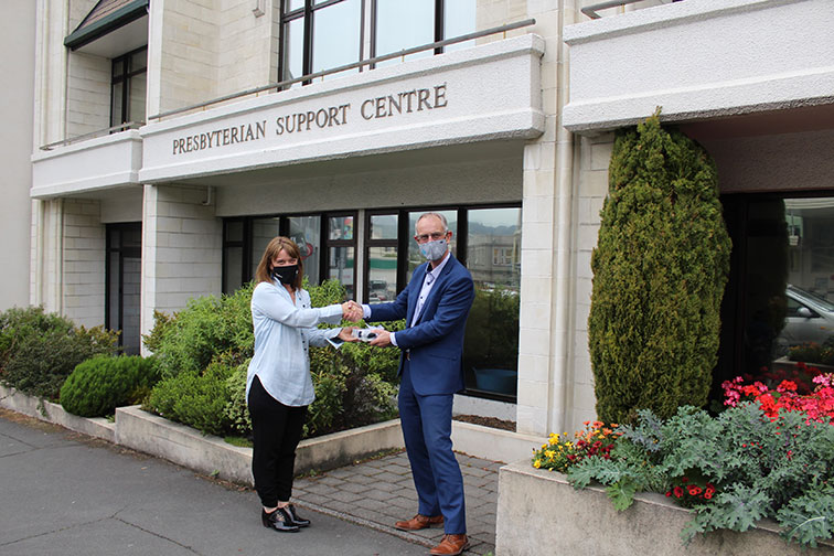 Middle: Dunedin Partner Frazer Barton presenting Foodstuff vouchers to Presbyterian Support Otago