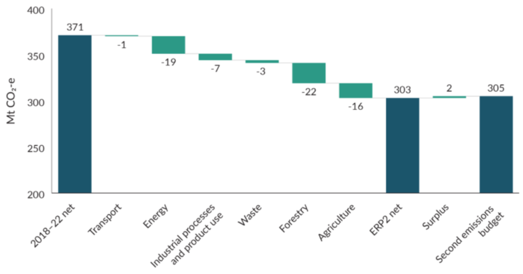 While ERP1 heavily emphasised emissions reductions in the transport sector, ERP2 is relying on anticipated emissions reductions in the agriculture sector. Both ERP1 and ERP2 also rely on emissions reductions in the energy sector, as well as on the continued sequestering of carbon by the forestry sector, as key to meeting their respective emissions budgets.